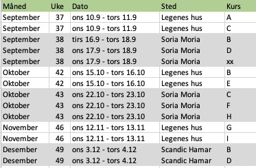 Tabellen viser oversikt over kurs i andre halvår 2025. Norsam har fått på plass et utvidet kurstilbud. Samtlige kurs gjennomføres i høstsemestet. Kurs B gjennomføres tre ganger, mens Kurs C og Kurs D gjennomføres to ganger. Dette gir god kapasitet og mulighet for å komme godt i gang med kursdelen av spesialistutdanningen.