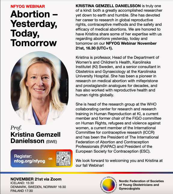 NFYOG holder et webinar om abort i regi av professor Kristina Gemzell Danielsson v/ Karolinska institutt den 21.11.23 klokken 1630.